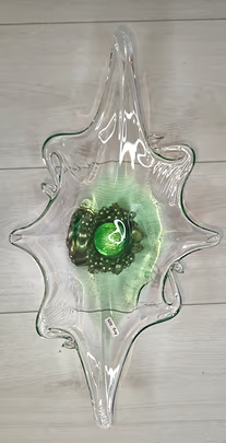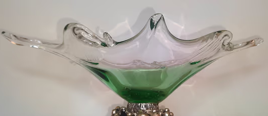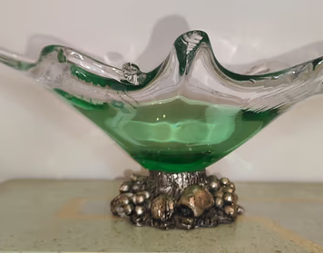 la meridiana splendido in vetro artistico italiano, raro, lavorato a mano dai maestri di Murano, su un piedistallo placcato in argento 925 con frutta decorata con sfumature verde brillante. Misure 40x22x14 cm. Vendo E. 40. Zona Perugia. Tel. al