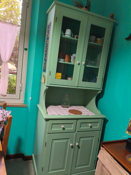 artigianale, mobile con due ante e due cassetti + vetrina due sportelli superiore (pezzi separati), color verde salvia, vendo prezzo da concordare. Zona Assisi. Tel. al